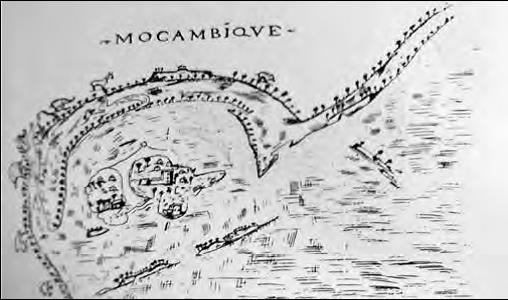 Moçambique – também é um lugar fortemente fortificado, onde os portugueses permutam bens europeus com os nativos pelo seu ouro, dentes de elefante e escravos. Aqui eles ancoram na ida e na vinda da India, e pedem refrescamentos.
