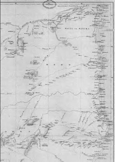 Em 1885, o cônsul inglês na África Oriental Portuguesa, tenente H.E. O’Neill, reconheceu o que se pode constatar nas imagens seguintes, que, na minha opinião pessoal, são das mais elucidativas e completas, abrangendo a principal zona da África Oriental Portuguesa a norte do rio Zambeze e a sul do rio Rovuma. A carta de O’Neill, demais conhecida internacionalmente, não interessa aqui apresentá-la, mas sim alguns pormenores. Na parte costeira, onde se vislumbram pequenos reconhecimentos que implantam alguma informação sobre o interior da zona norte de Moçambique. Além da costa, entre a Ilha de Moçambique e a foz do rio Rovuma, com todas as ilhas Quirimbas, apresenta diversos itinerários percorridos por militares em patrulhas e outras deslocações, visualizados pela repetição de informações escritas ao longo do mesmo itinerário, tanto junto ao rio Rovuma, quer ao longo do rio Messalo, zona do Medo, como para o interior da Ilha de Moçambique, em várias direcções, e mesmo cruzando estas direcções, entre os rios já referidos.