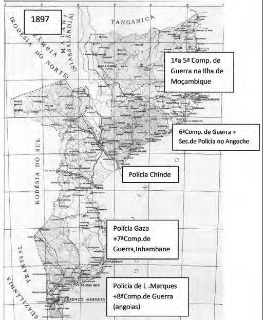 Ainda neste século, se repararmos na distribuição das unidades militares, em 1897, indicada no mapa da figura 22, todas elas estão instaladas na costa marítima da Província: cinco, na Ilha de Moçambique, e mais três, no Angoche, em Inhambane e Lourenço Marques, além de Polícia, nestas três cidades e Chinde. No fim do século XIX, o interland de Moçambique estava vazio de ocupação militar e civil, pelo que, digamos, 90% da província estava nas mãos dos prazistas[2], brancos, negros, mulatos, por vezes indianos e também cadastrados deportados de Portugal e do Brasil.