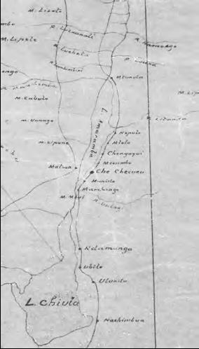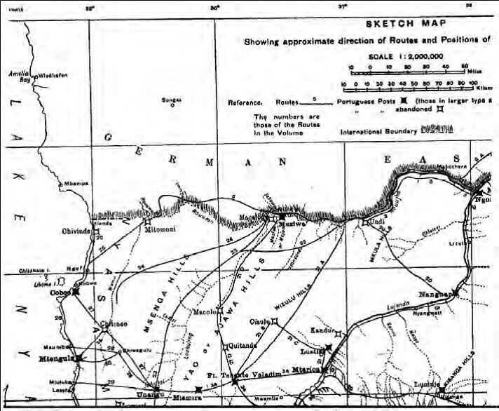 Assim, quando, em 1914/18, Moçambique foi invadido por tropa alemã, nem cartas aproximadas do Niassa existiam e, se apareceram algumas, foram fornecidas pelos aliados ingleses que, de há muito, reconheciam estas zonas como sendo de interesse futuro para os seus colonos. Basta analisar a existência de dezenas de missionários protestantes ingleses nos arredores do lago Niassa. A carta inglesa de 1918, de que se junta porção, era a única cartografia existente fornecida às tropas portuguesas face à invasão alemã e como se pode ver pouca ou nenhuma informação continha (figura 35).