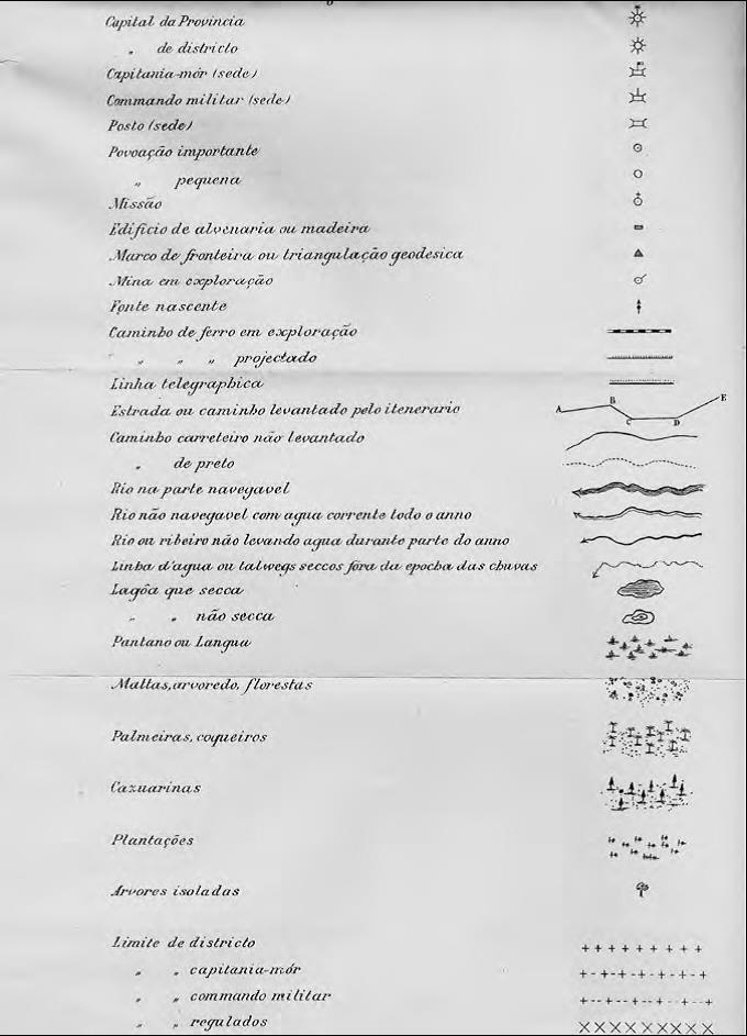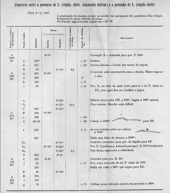 A Caderneta do Itinerário, de que se mostra exemplo na figura 30, pode ser completada com informações dos indígenas: “O official deve ser acompanhado por um guia da região, que substituirá de povoação em povoação, para melhor garantir a verdade da informação. A toponímia local deve ser escrita o mais correcta possível”.