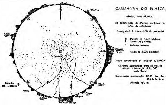 Como se pode observar, os desenhos apresentavam as palhotas orientadas e com localização geográfica aproximada, e incluía um giro do horizonte com indicação do relevo visível de um “morro de muchém”, no centro da zona.