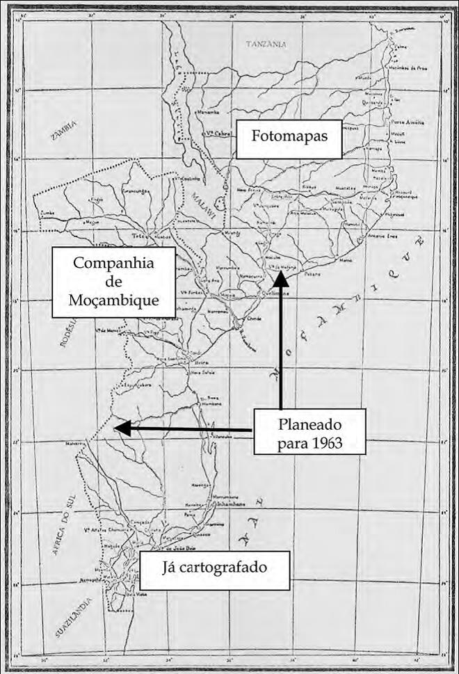 – as áreas da responsabilidade dos Serviços Geográficos e Cadastrais de Moçambique, prometidas para o ano de 1963, são indicadas com setas, Zambézia e Sul do Save;