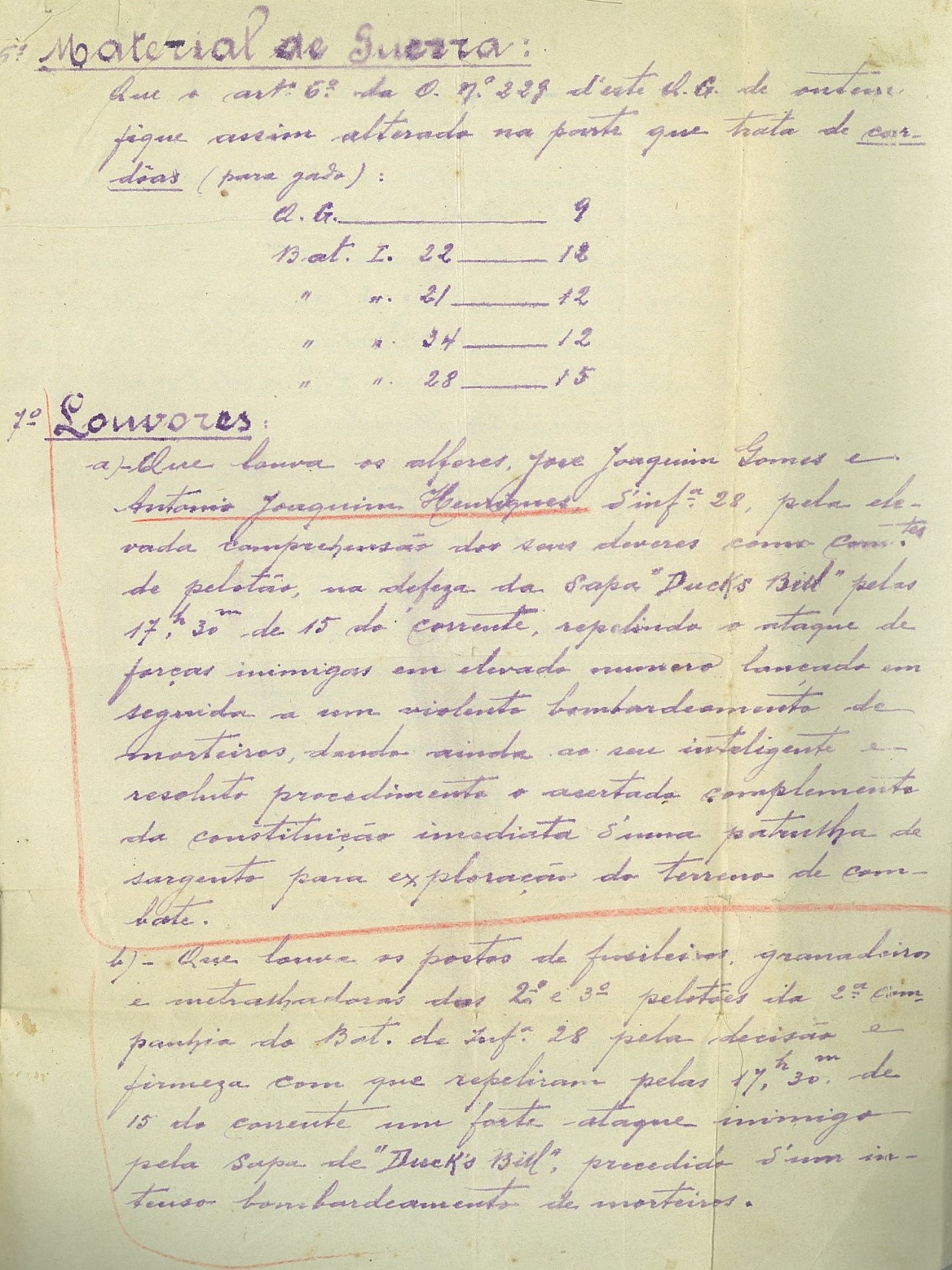 – Louvor aos alferes José Joaquim Gomes e António Joaquim Henriques, de Inf.a 28, pela elevada compreensão dos seus deveres como comandantes de pelotão na defesa da Sapa “Ducks Bill” pelas 17h30 de dia 15 do corrente, repelindo os ataques de forças inimigas em elevado número lançado em seguida a um violento bombardeamento de morteiros, dando ainda ao seu inteligente e resoluto procedimento acertado complemento da constituição imediata duma patrulha de sargento para exploração do terreno de combate (este louvor foi publicado também na Ordem do Exército n.º 15 – 2ª Série – de 14 de Setembro de 1920, pagina 670 e seu direito a 2ª condecoração com a Cruz de Guerra de 4ª classe).