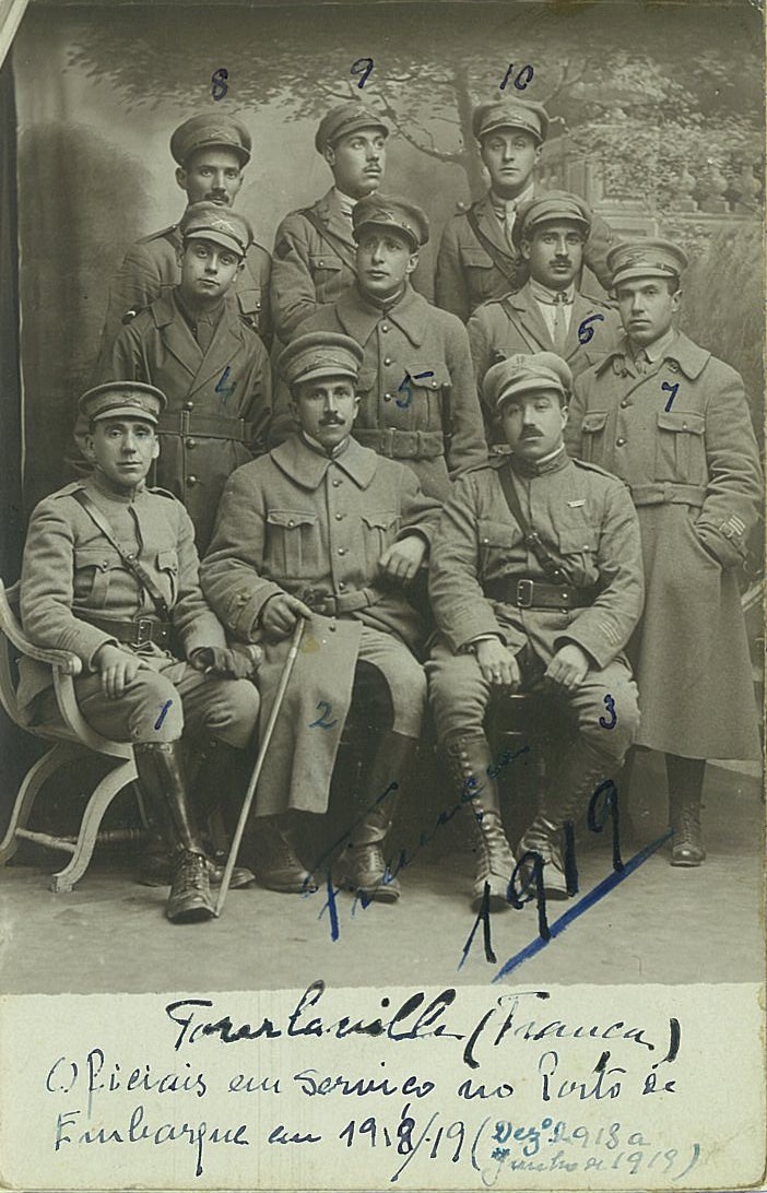fotografia n.º 11: Oficias em serviço no porto de embarque em 1919 – sentados na 1ª fila da esquerda para a direita: Capitão Almeida; Major (?); e Capitão Brites; na 2ª fila da esquerda para a direita: Alferes Mantinho; Capitão Marques; Alferes António Joaquim Henriques; e Capitão Glória; na 3ª fila da esquerda para a direita Alferes Massa; Alferes Sousa; e Alferes Figueiredo
