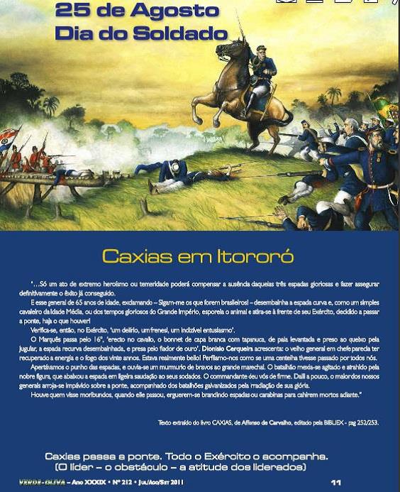 A imagem retirada da revista “Verde-Oliva”- nº 212, Jul/Ago/Set de 2011, p. 11 (figura 3), mostra a comemoração do Dia do Soldado, representando Caxias na Batalha de Itororó, e um trecho do livro “Caxias”, do biógrafo Affonso de Carvalho, no qual enaltecia enormemente a figura do “bravo Marechal”. Note como o Duque está posicionado na gravura, empunhando sua espada e montado em seu cavalo (possivelmente era o “Douradilho”, que ajudou-lhe a ganhar a batalha) durante o tiroteio entre as forças paraguaia e brasileira. A intenção é clara: mostrar a perseverança, perspicácia e heroísmo do comandante Caxias naquela ocasião, levantando a moral dos seus soldados diante do inimigo. Destaque para a última frase da gravura: “Caxias passa a ponte. Todo o Exército o acompanha. [O líder (Duque de Caxias) – o obstáculo (a ponte) – a atitude dos liderados (avançam ferozmente, a fim de liquidar o inimigo)].