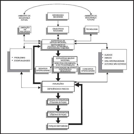 No final da década de 90 do século XX os planeamentos estratégico e de forças deixaram de estar focalizados na ameaça, para adoptarem um processo mais exigente do ponto de vista conceptual, mas operacionalmente necessário: as capacidades. Em parte, esta alteração traduziu um reconhecimento das múltiplas dinâmicas que tornavam o ambiente de segurança bem mais complexo e difícil que durante a guerra-fria. O envolvimento das forças militares no combate ao terrorismo a partir de 2001, intensificou a necessidade estratégica de forças militares mais ligeiras, flexíveis, móveis e prontas, capazes de operar um amplo conjunto de capacidades. Por isso, Portugal, como os seus aliados, passaram a reflectir nos respectivos sistemas de forças e dispositivo, as tendências orientadoras dos desafios e conceitos operacionais, bem como o processo contínuo para melhoria das capacidades das forças militares existentes e para alcançar as desejáveis. Na melhor das expectativas estas influências operacionais orientam a estratégia militar nacional, o orçamento e os programas, e o entendimento das capacidades existentes e desejáveis do sistema de forças e do dispositivo de forças. Complementarmente, a estratégia militar nacional, a directiva orçamental e de programação, e as capacidades existentes e desejadas, forçam o refinamento dos conceitos operacionais e os caminhos para ultrapassar os desafios operacionais. O modelo da figura apresenta setas com duplo sentido, evidenciando as múltiplas influências e interdependências da estratégia militar, da directiva orçamental e de programação, e das capacidades existentes e desejadas, relativamente a desafios e conceitos operacionais.