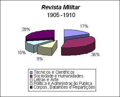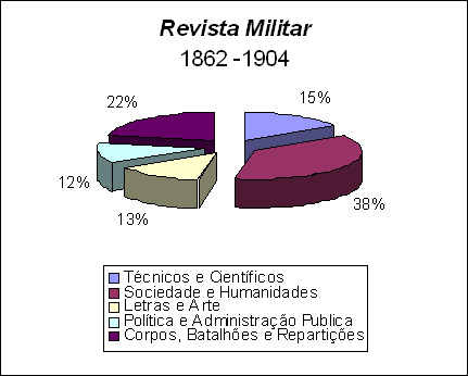 Fonte: A. H. M. Registo estatístico comparativo entre as temáticas científicas e de humanidades com as temáticas de cariz estritamente militar «Corpos, Batalhões e Repartições» publicados nos Tomos XIV a LVI da Revista Militar de 15 de Janeiro de 1862 a 31 de Dezembro de 1904.
