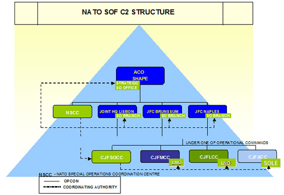 Na NATO a capacidade de comando é garantida através da estrutura de comandos permanentes, Allied Command Operations (ACO) e Allied Command Transformation (ACT) ao nível estratégico e com o JFC Brunssum, JFC Naples e o JC Lisbon ao nível operacional. Estes comandos dispõem, todos, de células de Operações Especiais.
