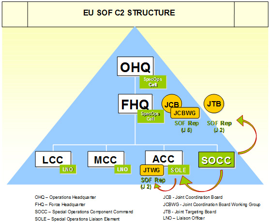 A União Europeia segue os mesmos princípios orientadores em uso na NATO. Dispõe de um conjunto de estados-membros que constituem o Operations Headquarters (OHQ) ao nível estratégico e o Force Headquarters (FHQ) ao nível operacional. Estes comandos dispõem, também à semelhança da NATO, de células de Operações Especiais.