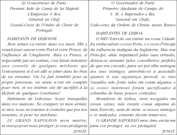 Esta proclamação tinha sido mandada afixar pelas ruas e praças de Lisboa na madrugada daquele dia 30 de Novembro de 1807, tanto em francês como em português, para que não restassem dúvidas. Fazemos nossas as palavras de José Acúrcio das Neves e transcrevemos também a proclamação em francês: “[...] a peça é tão interessante, tão extraordinária [...] que eu não posso dispensar-me de a transcrever toda inteira, [...].” 25: Vejamos o que disse Junot: