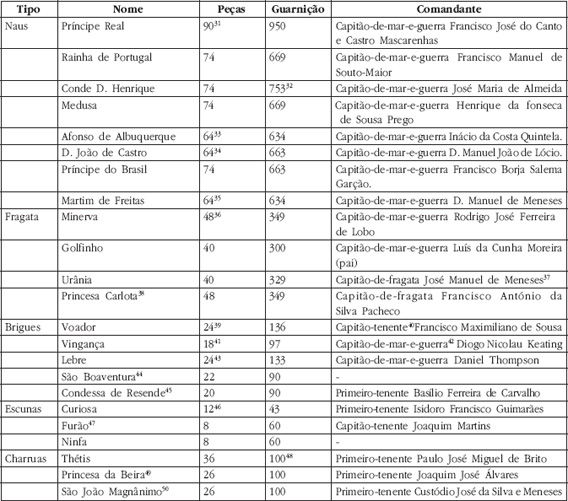 Segundo José Acúrsio das Neves, a esquadra portuguesa era composta de oito naus, três fragatas, três brigues, uma escuna e o seu comandante-em-chefe era o Vice-Almirante. Este número de navios não é unânime para todos os autores onde o assunto é debatido, conforme iremos ver na tabela30 que se segue: