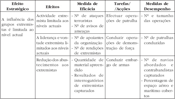 Os objectivos são depois analisados para derivar os efeitos pretendidos. Por exemplo se o objectivo é “proteger os interesses e instalações nacionais e NATO num país A”, então o efeito desejado poderá ser “o país A cessa o apoio às organizações terroristas”. Os efeitos precisam de ser mensuráveis, através da medição das tendências no espaço de batalha (Medidas de Eficácia32). No caso do exemplo anterior a Medida de Eficácia poderia ser “a diminuição das declarações oficiais do país A em apoio das organizações terroristas”. Faltam ainda os indicadores, ou seja aquilo que é efectivamente medido (Medida de Desempenho33), como por exemplo, “declarações do governo do país A nos media em apoio das organizações extremistas”.