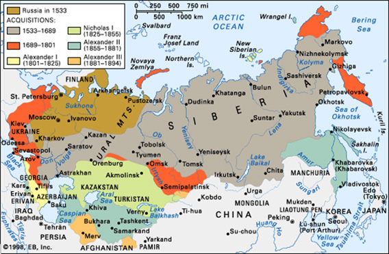 Até então, os estrategistas consideravam que o poder da Rússia era apenas defensivo, a coberto da fortaleza inexpugnável com que a natureza a tinha contemplado - o seu clima e os seus desertos - conforme Napoleão tinha descoberto à sua própria custa. Mas, na realidade, desde o reinado de Pedro “o Grande”, os súbditos do Czar tinham aumentado quatro vezes, de 15 para quase 60 milhões. Ao mesmo tempo, as fronteiras da Rússia tinham avançado cerca de 800 km em direcção a Constantinopla e cerca de 1 500 em direcção a Teerão, a uma razão de mais de 50 000 km2 por ano. Na Europa, as conquistas russas sobre a Suécia montavam a metade da área original daquele reino, e sobre a Polónia eram quase iguais à área de todo o Império Austríaco. Todo este território tinha sido conseguido furtivamente, através de astúcia e pequenas invasões sucessivas, nenhuma delas suficientemente importante para causar fricções importantes com os outros poderes europeus.17