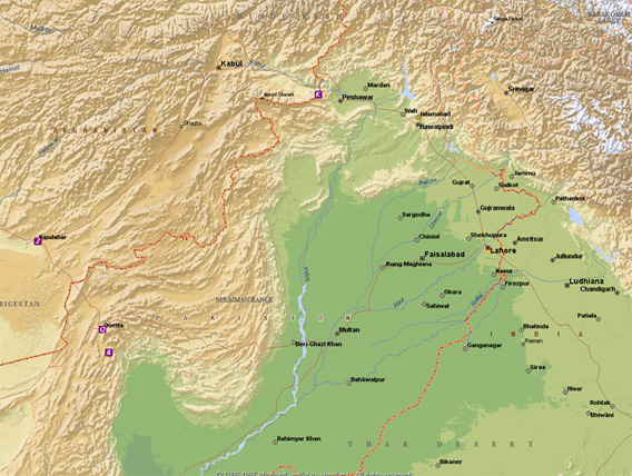 - uma seria partindo de Orenburg (3, Fig. 1 e 3), capturar Khiva (2, Fig. 3) e Balkh (6, Fig. 3), atravessar o Hindu Kush, como tinha feito Alexandre “o Grande”, e dirigir-se a Kabul; daí marcharia para Jalalabad, atravessaria o Desfiladeiro Khyber (K, Fig. 4) para Peshawar e chegaria ao rio Indo; esta rota, embora mais longa, tinha mais água que a rota alternativa, através do Karakorum, e evitava os confrontos com os perigosos Turcomenos;