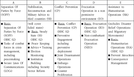 No Catálogo anterior, HHC 2003, só estavam definidos os Cenários de Separação de Partes pela Força, Prevenção de Conflitos e Assistência Humanitária12, pelo que o número de Requisitos era menor13 do que o actual que define cinco cenários de planeamento.