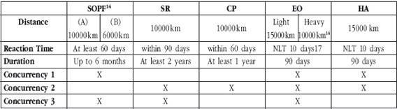15 A distância é contada a partir de Bruxelas e varia entre 6 000 e 10 000 km. Conforme se pode observar na tabela supra, para todas as operações e de 15 000 km para as operações de Evacuação e de Assistência Humanitária. Esta última distância foi uma solicitação nacional, para podermos chegar até Timor.