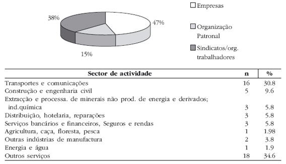 Os participantes que responderam aos instrumentos da OIT foram: 8 sindicatos ou organizações de trabalhadores, 1 organização patronal e 5 empresas. (sectores: transportes, banca, petrolífero, construção...).