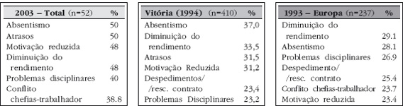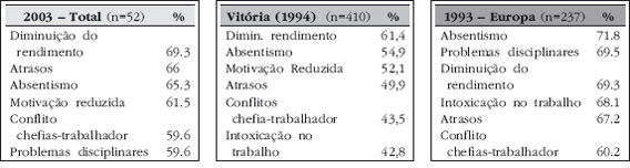 Absentismo, diminuição do rendimento, abuso de substâncias no local de trabalho e problemas disciplinares são as situações mais problemáticas. As substâncias que causam maior preocupação são o álcool e as drogas de prescrição médica. Evidencia-se que o consumo destas ultimas está a aumentar.