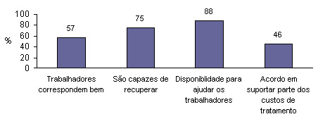 Os três grupos de participantes concordavam que os trabalhadores com problemas de álcool e drogas podiam ser ajudados. Os representantes das organizações de trabalhadores (mais do que os representantes das empresas) consideravam que as respectivas organizações deviam fornecer assistência aos trabalhadores e possuíam a responsabilidade de apoiar o tratamento, pagando os custos inerentes. Apenas um terço dos participantes concordava que deveriam suportar os custos do tratamento de um trabalhador.