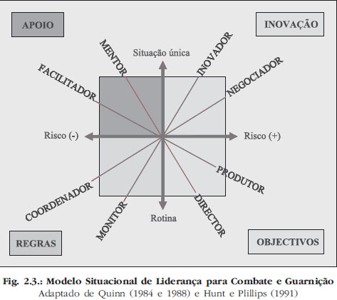 Este modelo situacional de liderança militar baseia se na frequência esperada de determinados acontecimentos e no risco que lhe está associado. A partir de um sistema de eixos ortogonais (eixos XY), formando quatro quadrantes, são representadas duas dimensões diferentes mas relacionadas entre si (frequência e risco), as quais permitem um esquema de referência para posicionar e distinguir várias situações ou diferentes missões passíveis de serem atribuídas aos líderes militares, podendo ir desde o combate propriamente dito (quadrante I), a uma situação típica de guarnição (quadrante III).