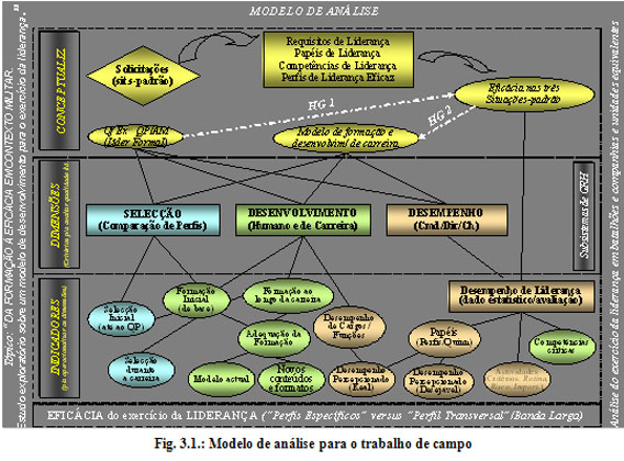 A questão central e as questões derivadas permitiram, numa primeira fase, orientar a revisão de literatura e, numa segunda fase, a pesquisa de campo. Combinando alguns conceitos chave com as hipóteses gerais de investigação foi elaborado um modelo de análise para o trabalho de campo (o qual se apresenta mais à frente), onde se prevê a avaliação de várias hipóteses operacionais a partir de três grandes dimensões - selecção; desenvolvimento; desempenho - com recurso à combinação de metodologias quantitativas e qualitativas, sobre dados obtidos por questionário aplicado a sub amostras constituídas por oficiais do Exército e por cadetes dos 1º e do 4º ano da Academia Militar.