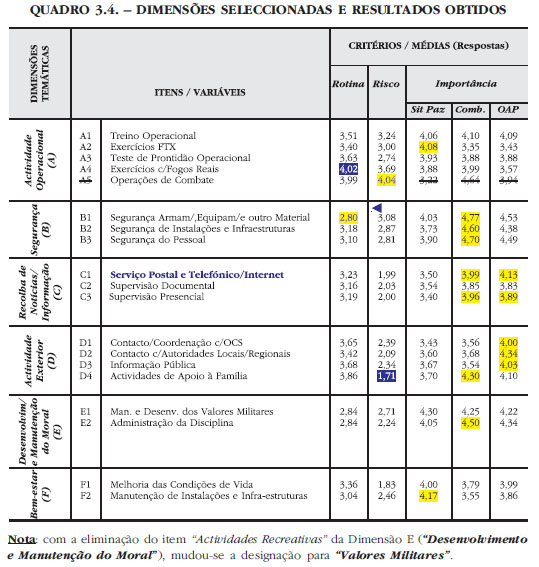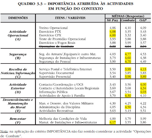 43 Outra opção passaria por agregar esta actividade à dimensão F - “Bem Estar”, dada a afinidade estatística que é possível perceber. Por outro lado, a sua manutenção no leque de actividades consideradas é justificada pela importância que assume nos contextos de OAP e de combate: nestas situações é essencial manter a tropa “ocupada” quando não está em acção ou em treino.