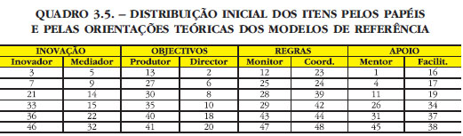 A eliminação dos itens que apresentam menor correlação com o total, no âmbito de cada agrupamento temático (papel de liderança) e a integração dos resultados obtidos nas três situações tipo conduz a uma solução próxima da que resulta da AFCP e que é apresentada no Quadro 3.11. A excepção verifica se no item 42 que deverá substituir o item 24 em COORDENADOR e no item 26 que poderá substituir o item 1 em MENTOR.