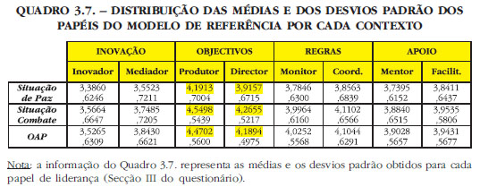 A partir da leitura do Quadro 3.7. poderá ser feita uma análise mais fina, parecendo ser confirmada a maior incidência de comportamentos orientados para os OBJECTIVOS, correspondentes aos papéis de liderança PRODUTOR e DIRECTOR. A orientação APOIO situa se próximo do “Quase Sempre”, enquanto que a orientação REGRAS, tida como “Com Frequência” no quadro anterior, parece assumir aqui maior relevância que a orientação APOIO, embora essa diferença seja mais notada em situação de combate e em operações de apoio à paz. A orientação INOVAÇÃO continua a ser a menos relevante para os três cenários definidos para a actuação do líder em contexto militar.