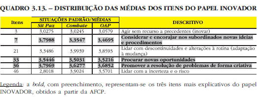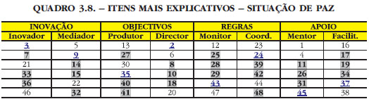 Uma análise mais pormenorizada, ao nível dos itens do papel INOVADOR, é apresentada no Quadro 3.13. A percepção que se tem é a de que as médias dos itens seleccionados (7, 33 e 36) são uma consequência (em termos comportamentais) dos itens 3, 21 e 46, vistos de forma independente no âmbito de cada situação padrão. Dada a sua natureza, poderão materializar, no essencial, em contexto militar, uma certa “manipulação” orientada para as dimensões OBJECTIVOS e APOIO dos modelos de referência.