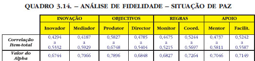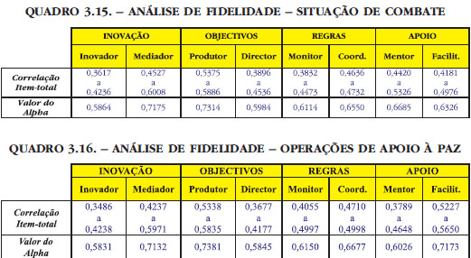 Depois de reduzir alguns itens, os resultados da análise das três situações tipo apontam, de uma forma geral, para uma consistência interna aceitável, tal como se apresenta nos Quadros 3.14., 3.15. e 3.16., variando a correlação item total de 0,4187 a 0,6748 para a situação de paz, de 0,3617 a 0,5375 para a situação de combate e de 0,3486 a 0,5835 para as operações de apoio à paz. Os valores do Alpha de Cronbach variam de 0,6744 a 0,7896 para a situação de paz, de 0,5864 a 0,7314 para a situação de combate e de 0,5831 a 0,7381 para as operações de apoio à paz.
