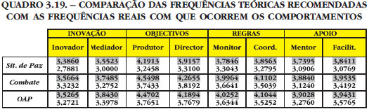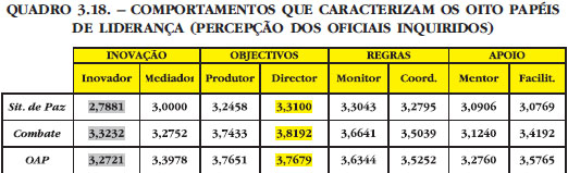 Da leitura do Quadro 3.19. verifica se que o desempenho organizacional dos oficiais na execução de funções de liderança (desempenho efectivo) é considerado, em média, inferior ao definido na Secção III (desempenho recomendado), em todos os papéis e para as três situações padrão. As maiores diferenças situam se, para os três contextos, no papel PRODUTOR (0,9455 em situação de paz, 0,8065 em combate e 0,7051 em OAP). As menores diferenças situam se no papel MONITOR para a situação de paz (0,4803) e no papel INOVADOR para a situação de combate (0,2432) e para as OAP (0,2544).