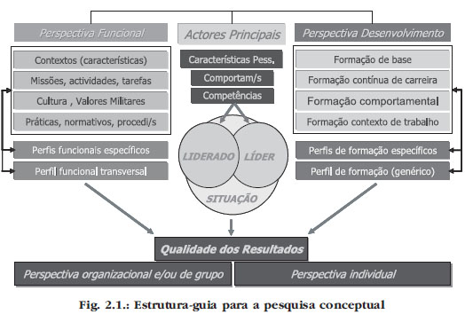 Nesta investigação interessava nos, sobretudo, a acção de liderança em contexto organizacional ou em grupos organizados, tendo em vista a obtenção de resultados concretos (e.g., o cumprimento de uma missão específica em contexto militar). Para apoiar a pesquisa foram seleccionadas duas grandes perspectivas/dimensões de análise: funcional e de desenvolvimento. Na figura 2.1. apresenta se a macro seguida na pesquisa conceptual.