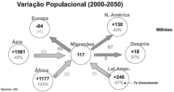 A leitura deste quadro sobre a projecção da variação populacional até metade do nosso sé­cu­lo diz nos que as migrações mais significativas serão provenientes da Ásia, da América Latina e de África, segundo esta ordem, e dirigir-se-ão para a América do Norte, para a Europa e para a Oceânia, também segundo esta ordem. O que parece de assinalar é que, apesar de a Europa ir continuar a ser um continente re­cep­tor de populações emigradas, não deverá, ainda assim, ver a sua população aumentada em termos absolutos. Isto é, mesmo com a imigração, os valores totais da população deverão diminuir, e se não existisse imigração diminuiriam muito mais, como é evidente.
