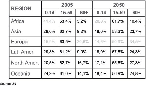 Se considerarmos os três grupos etários normalmente adoptados nos estudos demográficos, ou seja um grupo com idades compreendidas entre 0 e 14 anos (jovens), outro com idades entre 15 e 59 (activos), e um outro compreendendo os indivíduos com mais de 60 anos, a leitura deste quadro mostra nos que 94,8% da população africana tem menos de 60 anos, sendo este valor de cerca de 91% para o caso da América Latina e da Ásia e de 83,3% para a América do Norte, enquanto a Europa apresenta menos de 80%. Mas as diferenças serão ainda mais notáveis em meados do século.