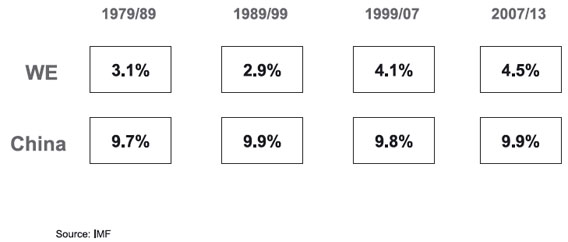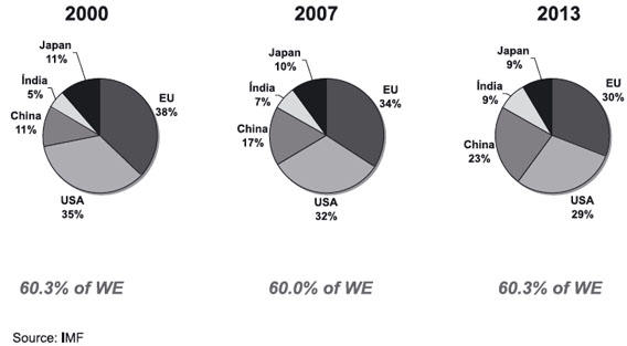 Do ponto de vista global, prevê-se uma certa estabilidade no crescimento da economia até 2013, mas internamente está em marcha um processo de redistribuição considerável. Assim, a China experimenta um processo de subida acentuada e prevê-se que assim continue no espaço de tempo da nossa análise, aproximando-se, em termos de dimensão económica, dos valores dos Estados Unidos da América (cuja paridade se estima poder ser alcançada em menos de duas décadas).