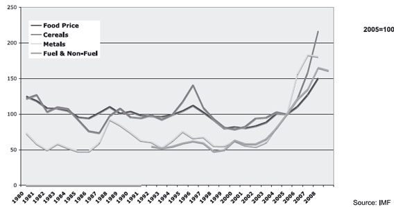 De facto, a flutuação dos índices de preços de bens primários sofreu um movimento ascendente extraor­di­ná­rio a partir de 2006 e estima-se que mantenha esta tendência no curto prazo, como se pode ver no quadro.