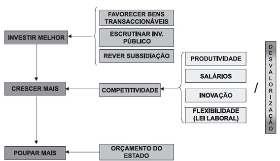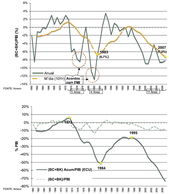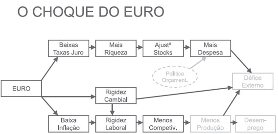Sem entrar em grandes explanações de teoria económica, recordo que, sem a possibilidade de actuar na política monetária e com o incentivo ao consumo decorrente da baixa ta­xa de juros, se criou uma grande pressão sobre a despesa. Por outro lado, a baixa inflação (resultante do novo regime económico), combinada com uma grande rigi­dez cambial e laboral, conduziu a uma falta de competitividade e à quebra do potencial produtivo. Os dois efeitos combinados acabaram por dar lugar à constituição de crescentes défices externos.