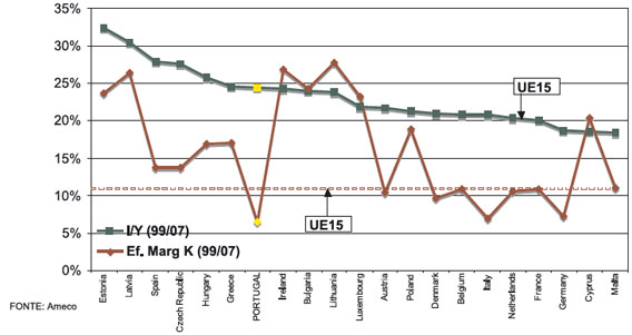 De facto e quanto ao investimento, o que o quadro acima nos mostra é que, ao contrário do que muitas vezes se afirma, não tivemos um problema de investimento, em termos brutos, dado que investimos ao nível dos nossos parceiros europeus, relativamente ao produto. O problema é que tivemos uma baixa eficiência marginal do capital, ou seja, uma baixa produtividade. Na minha opinião este resultado reflecte, por um lado, o excesso de investimentos feitos ou induzidos pelo Estado, sem critério económico, e, por outro o provável excesso de subsidiação do investimento privado.