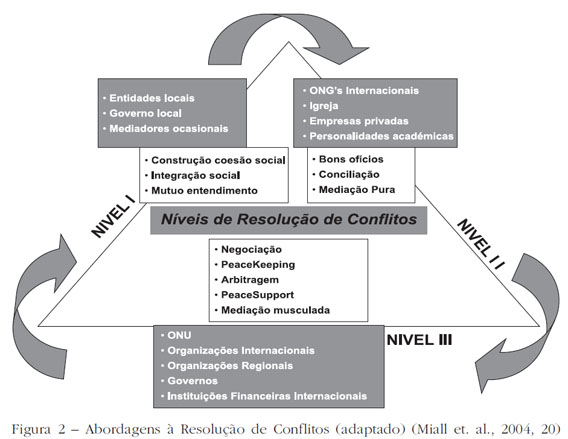 O modelo admite um nível de comprometimento de meios e de acções que foram designados e estratificados por: “Nível I”, mais baixo e limitado no âmbito, estando reservado e vocacionado à resolução local e onde se recorre por excelência, à resolução interna do conflito, afectando entidades locais e o próprio Estado, no sentido de resolver o conflito intramuros. O “Nível II”, que se refere à intervenção de entidades ou de actores de nível sub-regional, ONG’s, empresas e organizações privadas e num “Nível III”, nível máximo de intervenção, normalmente de dimensão regional, internacional e multinacional, em que se emprega um conjunto de mecanismos com meios mais robustos, complexos e por norma, globais, como último rácio para resolver o conflito (Miall et. al., 2004, 20). Neste modelo, são ainda apresentados conteúdos relativamente à adopção de iniciativas com vista a adequar a intervenção dos vários agentes que actuam aos diferentes níveis de resolução do conflito. Importa contudo reter que, actualmente, a intervenção na resolução de conflitos integra conjunturalmente um ou mais níveis, que numa intervenção, agentes do Nível II ou mesmo do Nível III, podem actuar antes ou em sobreposição com os do Nível I. Contudo, parece-nos que o modelo pode constituir uma base conceptual útil para que se possa fazer uma abordagem teórica à resolução de um conflito regional num determinado continente.