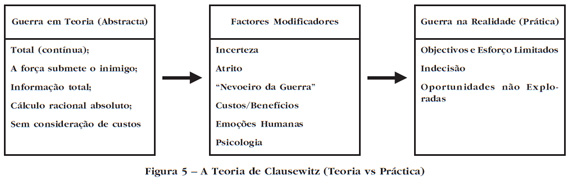 Esta preocupação militar - compreensível - pela necessidade de simplificação de um fenómeno cuja condução optimal é o resultado da confluência de uma plêiade de factores tangíveis e não tangíveis, que compete ao comandante descodificar, não encontrou resposta cabal na obra de Clausewitz, pois para ele muitos são os caminhos que conduzem ao sucesso. A sua abordagem da guerra com base numa “dialéctica dos opostos”110, entre teoria e prática, entre guerra real e absoluta, entre racionalismo e emoções primárias, entre campo moral e campo físico, entre génio do indíviduo e espírito do exército, entre ataque e defesa, entre aniquilação e atrito, entre guerra regular e guerra de guerrilha tem a vantagem de permitir uma comparação das díades e uma clarificação do pensamento do leitor o que é o objectivo fundamental de uma teoria que se pretenda assumir como tal.