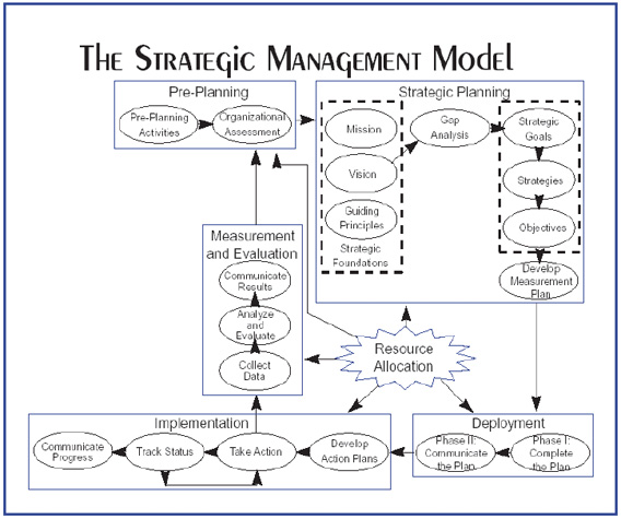 O modelo seguinte espelha as cinco fases de gestão estratégica de uma organização.