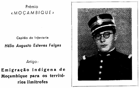 A concessão do Prémio “Moçambique” ao actual decano dos Sócios Efectivos da Revista Militar (1947), Major-General Hélio Augusto Esteves Felgas, na altura Capitão de Infantaria, pela publicação do artigo, “Emigração Indígena de Moçambique para os territórios limítrofes”, publicado no número doze da Revista de 1954.