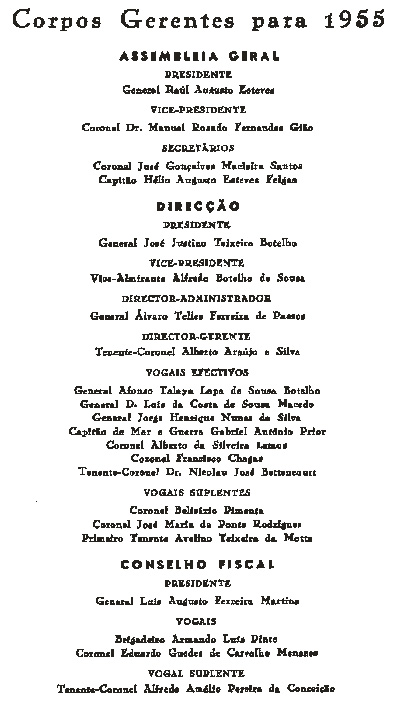 No Inverno de 1955 os CG eram vinte e dois (AG/4, Dir/14 e CF/4), continuando o Presidente da Direcção a ser nomeado anualmente pelo Ministro da Guerra de entre os Sócios Efectivos da Empresa, havendo Presidente (General Teixeira Botelho), Vice-Presidente (Vice-Almirante Botelho de Sousa), Director-Administrador (General Ferreira de Passos), Director-Gerente (TCor Araújo e Silva), sete Vogais Efectivos e três Vogais Suplentes.