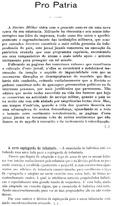 No Nº1, Janeiro de 1905, Ano LVII, os mandatários da nova Empresa da Revista Militar, escreveram “Pro Patria”, dizendo:
