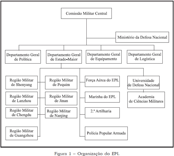 Um outro exemplo das dificuldades destas assimetrias organizacionais é o de que não existe na verdadeira acepção da “palavra e de funções” um equivalente ao Chefe de Estado-Maior do Exército português, o General Valença Pinto. As funções do seu Estado-Maior tal como dos da Marinha e da Força Aérea da maioria das forças armadas ocidentais, são desempenhadas na China primariamente pelo DGEM. Com o DGEM como orgão basilar, os vários Departamentos Gerais do EPL recebem informações dos vários comandos, consolidam-nas, planeiam e supervisam a implementação da estratégia militar do EPL. Desta forma pode-se afirmar que não existe na verdadeira acepção do termo uma estratégia do Exército; verifica-se antes a existência de uma estratégia do EPL na qual as forças terrestres são os elementos básicos apoiados por forças aéreas e navais e que desempenham o papel central, ainda que não completo, nos cenários de combate. Existem ainda algumas outras assimetrias na forma como a doutrina é desenvolvida e aplicada. Um escalão abaixo do DGEM existem as Regiões Militares (uma versão chinesa do que é um Comando Conjunto) e uma série de comandos de apoio, incluindo o da Marinha, da Força Aérea, e da 2ª Artilharia. Os comandantes equivalentes aos Chefes de Estado-Maior da Marinha e da Força Aérea portuguesa comandam os respectivos ramos como se estes fossem grandes unidades, detendo um menor grau de responsabilidade no EPL do que os seus congéneres portu­gueses.