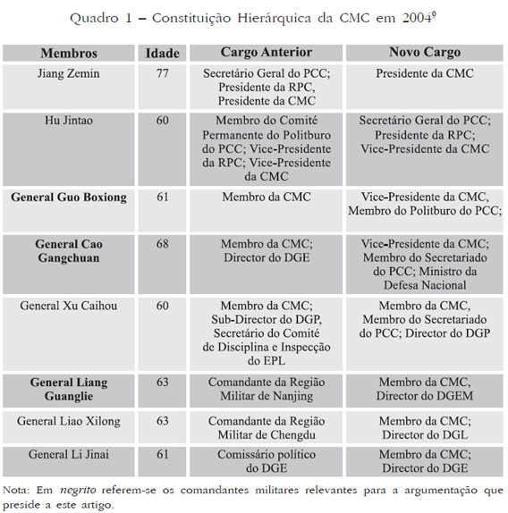 10 Uma vez que Jiang Zemin antigo Presidente da China e Secretário Geral do PCC manteve-se como Presidente da CMC em Novembro de 2002, à semelhança do que havia sucedido com Deng Xiaoping. Esta continuidade de Jiang cria uma limitação ao espaço de manobra política de Hu Jintao, não obstante este ser Vice-Presidente da CMC desde 1997, altura em que a sua nomeação para este cargo deixou indiciar a possibilidade de vir a ser o sucessor de Jiang à frente dos destinos da China (o que se confirmou).