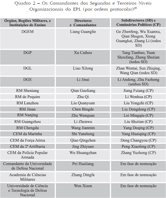 9 Independentemente do facto de Liang Guanglie ser o Director do DGEM, tendo precedência sobre Xu Caihou do DGP, este está hierarquicamente acima do primeiro porque assume funções no Secretariado do PCC.