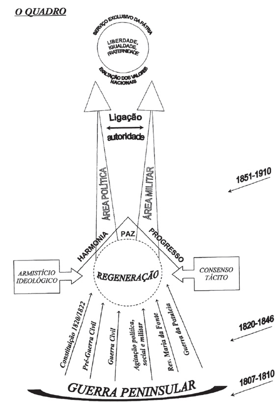 Quando, conjuntamente com conceituados, esclarecidos e ilustres políticos, intelectuais e jornalistas decidiram contribuir para o Movimento da Regeneração, no âmbito de um conservadorismo-autoridade em que eram condicionantes a harmonia e a paz e determinantes o progresso das estruturas do País e o incremento do bem-estar das suas populações, sempre os militares, na sequência da sua histórica missão de devotação à Pátria, tiveram em vista nele empenhar-se com a honestidade e a solidariedade que se exigiam, assumindo-se lado a lado com os detentores do poder político até ao último limite dos seus meios, também eles, no entanto, muito carentes de renovação e de possibilidades.