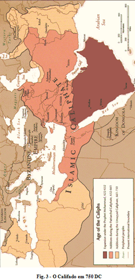 Maomé morreu em 632 DC. Os seus companheiros estabeleceram o Califado (a sucessão) (Fig. 3) e Abu Bakr, escolhido democraticamente entre eles, tornou-se o primeiro Califa. (98) Em 661, a morte de Ali, 4.º Califa e genro de Maomé, provocou uma luta pelo poder entre os seus seguidores e a dinastia Ummayad, sedeada em Damasco. O “Shi’at ‘Ali” (Partido de Ali) continuou a reclamar o seu direito ao califado. Dissidiu e, ao longo dos tempos, criou a sua própria teologia (shiita).